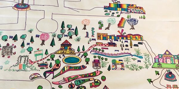 Guided meditation and storytelling followed by a group drawing activity to create a super city, and wonderful world giant drawing.